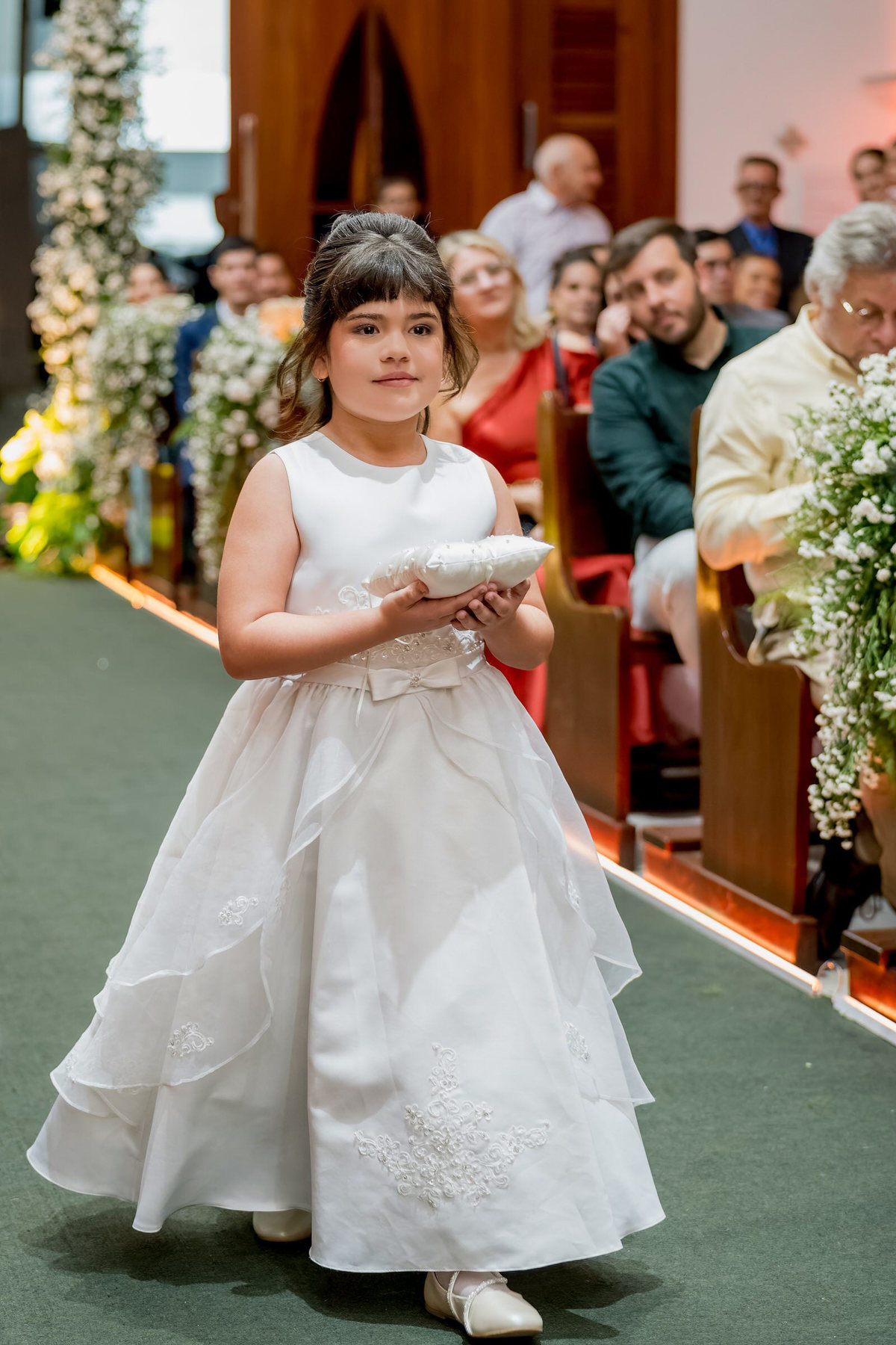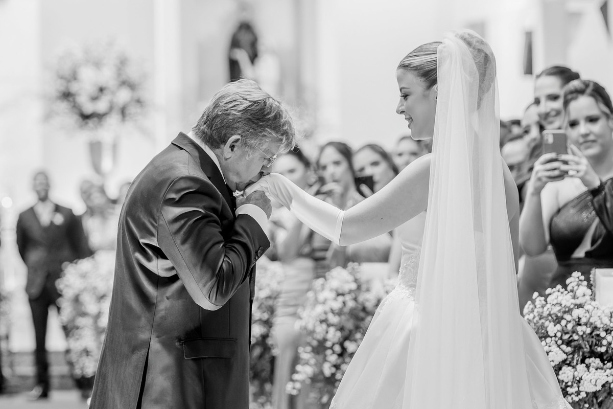 A igreja estava lindamente decorada para receber os noivos e seus convidados. Gabriela fez sua entrada triunfal ao lado de seu pai, Sr. Fco Jadiel, ao som de “Marcha Nupcial” e “Céu de Santo Amaro”, enquanto Igor aguardava ansiosamente no altar, acompanhado de sua mãe, Sra. Zued. A emoção estava estampada no rosto de cada um dos presentes.